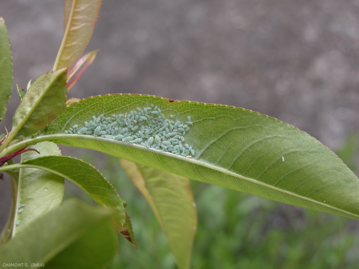 Les oeufs d'hiver, déposés en très petit nombre sur les troncs et les branches des hôtes primaires, éclosent dans le courant du mois d'avril. Deux à trois générations d'aptères se succèdent et pullulent sur la face inférieure des feuilles qui s'enroulent très faiblement et prennent une teinte vert pâle.
