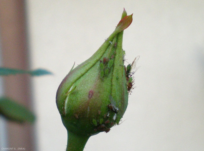 Son hôte primaire est le rosier (Rosa spp., figure 1) ou d'autres rosacées.