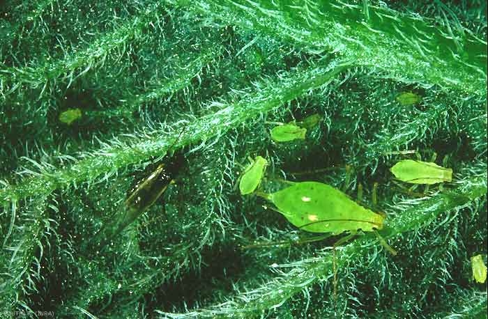 Les populations s'accroissent très rapidement dès le début du printemps. Dans des conditions favorables, elles peuvent doubler en 2,4 à 2,7 jours, la fécondité d'une femelle virginipare variant de 30 à 50 larves (figure 2). Les colonies s'installent de préférence sur les feuilles et les pédoncules floraux.