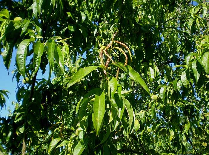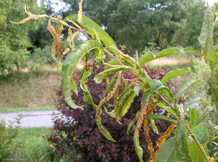 Les dégâts sont très typiques. Les pucerons se tiennent à la face inférieure des feuilles ; les deux bords des feuilles colonisées se roulent très fortement et longitudinalement, donnant à celles-ci l'aspect d'un cigare. On assiste progressivement à un rougissement du limbe (figures 2 et 3).