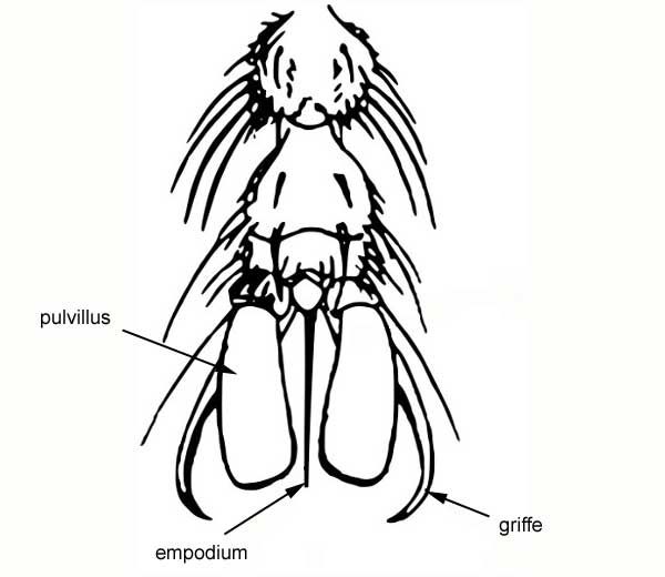 - empodium (figure 2) : lobe médian ou prolongement en forme d'épine situé sur la face inférieure du dernier article du tarse des insectes et qui porte, par ailleurs, 2 griffes (rarement une) et 2 pelotes ou pulvilles.