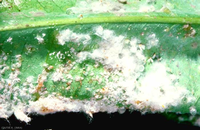 En automne les faces inférieures des feuilles sont encroûtées par des larves et des exuvies, recouvertes de miellat (figure 2).