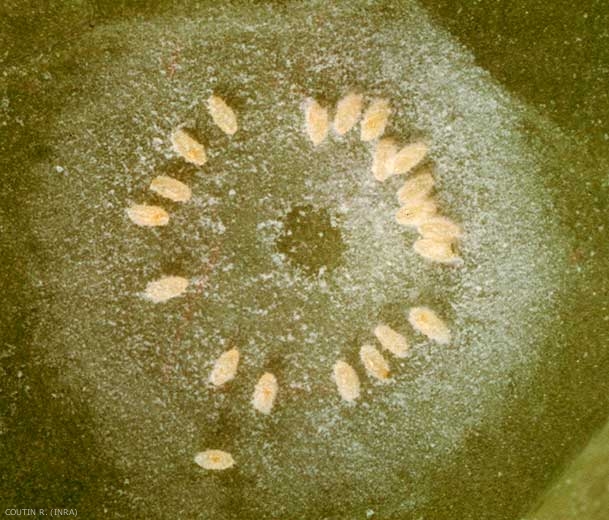 La femelle peut pondre plus de 500 oeufs au cours de sa vie qui dure 3 à 6 semaines. Les oeufs sont pondus disposés en cercle sur les feuilles lisses (figure 1) ; mais, sur les feuilles poilues, ils sont plutôt éparpillés et moins régulièrement disposés. Peu après la ponte, les oeufs prennent une couleur foncée ; leur éclosion a lieu 9 jours plus tard environ à 21°C. Les larves nouveau-nées passent par une courte période de mobilité avant de s'installer pour s'alimenter, leurs stylets enfoncés dans le tissu foliaire, ceci pendant la durée des 3 stades. Puis, elles cessent de s'alimenter, muent, et demeurent dans le puparium durant 18 jours environ (figure 2).