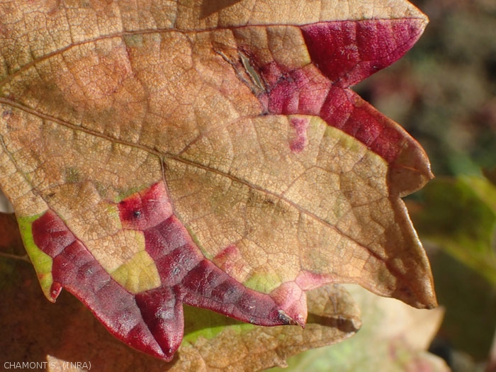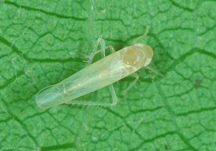 Pour se nourrir, la cicadelle insère son rostre dans les vaisseaux conducteurs, principalement ceux des nervures. Les piqûres d'alimentation provoquent des nécroses. Les nervures se dessèchent, le limbe de la feuille brunit. La progression de la "grillure" se fait depuis le bord du limbe vers le centre (figure 2). En cas de forte infestation, les feuilles peuvent tomber dès le mois d'août. Sur vigne, les zones desséchées sont soulignées par un liseré de couleur différente selon les cépages.