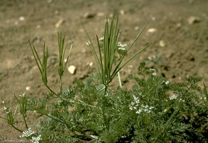 Feuilles ovales dans leur pourtour, bi-tripennatiséquées, découpées en lobes linéaires, mucronulés, rudes aux bords. Accentuation de la découpure et de la pilosité des feuilles au fur et à mesure. Pétiole canaliculé, pubescent. Présence d'une gaine à la base ;