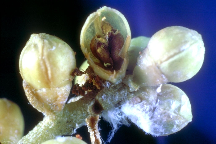 Les individus de la 2ème génération installés sur les hampes florales se montrent les plus nuisibles, car ils prélèvent la sève nécessaire au développement des fruits. Les colonies larvaires dépassant 7 à 8 individus par hampe sont dangereuses ; au seuil de 20 larves par hampe, la récolte est diminuée de 50 à 60%. Les filaments cireux donnent à l'arbre attaqué un aspect caractéristique (figure 1). La fumagine qui se développe sur le miellat aggrave la situation. La lutte contre ce ravageur demande d'intervenir de façon précoce.