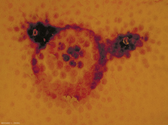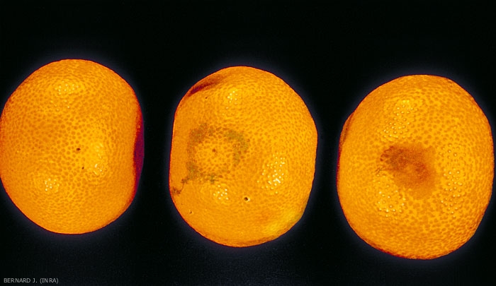 Les dégâts de la cératite peuvent très importants surtout en été et en automne. L'infestation est visible sur le fruit par une petite tache entourant le point de piqûre (figure 3), tache qui s'agrandit par la suite (figures 4 et 5). Une dépression se creuse en dessous, du fait de la pourriture des tissus (figure 6). Le fruit tombe prématurément. Un fruit seulement piqué une fois est absolument invendable.