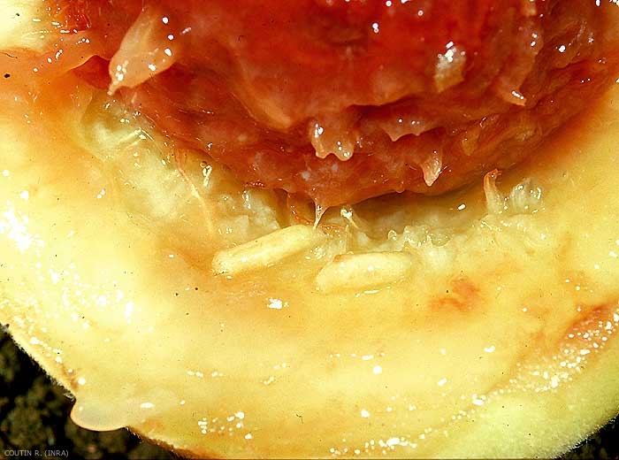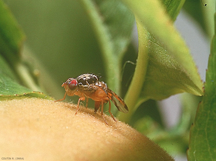 Adulte, les femelles, au moyen de leur oviscapte, pondent leurs oeufs (figures 1 et 2), groupés par 3 à 7, à l'intérieur des fruits, à une profondeur de 2 à 5 mm, environ. Plusieurs femelles peuvent pondre dans le même fruit, où l'on pourra trouver alors jusqu'à 80 oeufs. Dans les conditions optimales, la femelle peut pondre au cours de sa vie 500 à 600 oeufs. Les larves se développent aux dépens de la pulpe des fruits (figure 3) ; il leur faut à peu près 15 jours à la température moyenne de 25°C pour achever leur développement. La nymphe ne survit pas à une température inférieure à 2°C, maintenue une semaine. C'est en général à l'état de pupe, à quelques cm de profondeur dans le sol, que l'espèce hiverne. Dans le sud de l'Italie, un nombre réduit d'adultes peut aussi survivre sur les orangers des variétés les plus tardives.