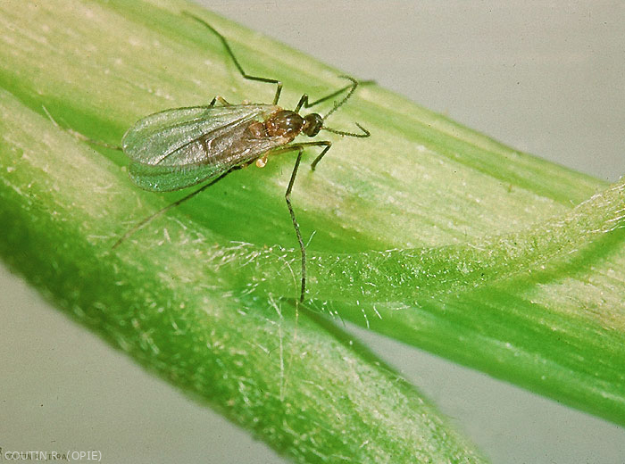 Au stade adulte le mâle mesure de 1,4 à 1,5 mm, la femelle mesure de 1,7 à 1,8 mm environ (figure 1) ; ils sont de couleur gris foncé mêlé de jaune pâle. L'oeuf est blanc, il mesure 0,3 mm. La larve est jaune pâle, elle mesure de 1,5 à 2 mm de long. La nymphe est jaunâtre, dans un cocon de 2 mm de long tissé dans le sol.