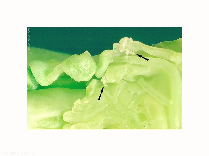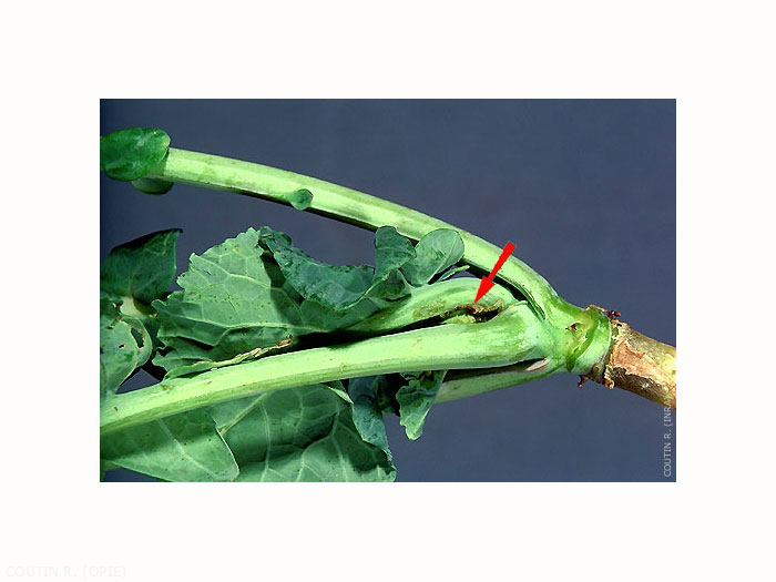 Les larves se développent à la base des feuilles centrales ; elles se nourrissent en rejetant de la salive qui digère les tissus végétaux avoisinants. Le pétiole des feuilles s'incurve, le limbe se boursoufle, le bourgeon central se désorganise et l'inflorescence centrale ne se forme pas (figure 2). Il apparaît à sa place une petite protubérance, le "chou borgne".