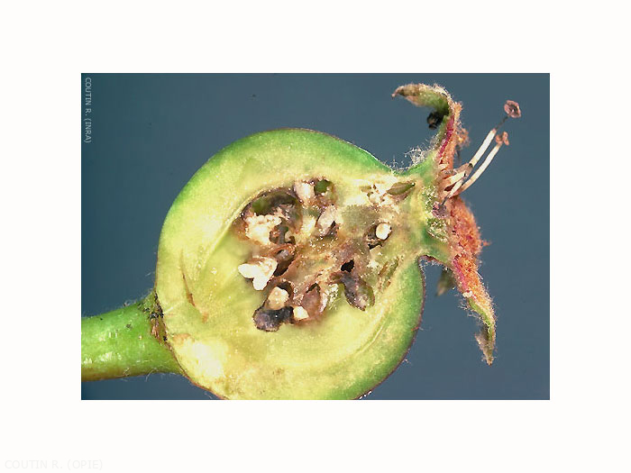 Les larves provoquent la déformation et une croissance accélérée de l'ovaire dans lequel elles se développent (figure 2). A la fin avril ou au début mai, les fruits attaqués se différencient des fruits sains par leur taille plus volumineuse et une forme irrégulière plus ou moins sphérique que l'on surnomme poires "calebassées" (figure 3) ; par la suite, la dimension des fruits sains atteint et dépasse celle des fruits attaqués. Les fruits attaqués tombent.