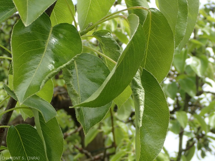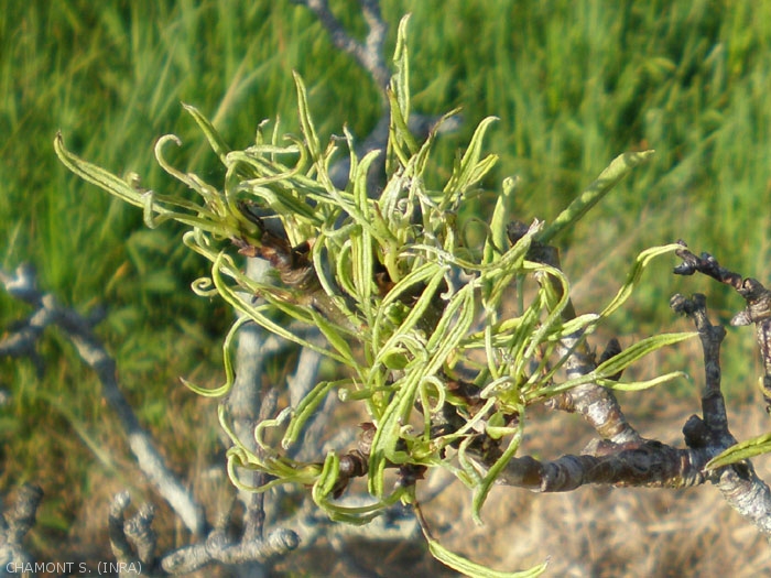 Sur les pousses attaquées, les jeunes feuilles restent enroulées longitudinalement, leur limbe s'épaissit considérablement, devient rigide et cassant (figure 1). Les 2ème et 3ème générations sont les plus dommageables, car elles correspondent à l'époque où la vigueur des pousses et la formation des jeunes feuilles est la plus intense.