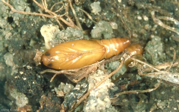 L'hivernation se fait sous forme de chenille ou de chrysalide dans le collet de la betterave, le sol ou les silos.