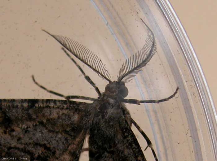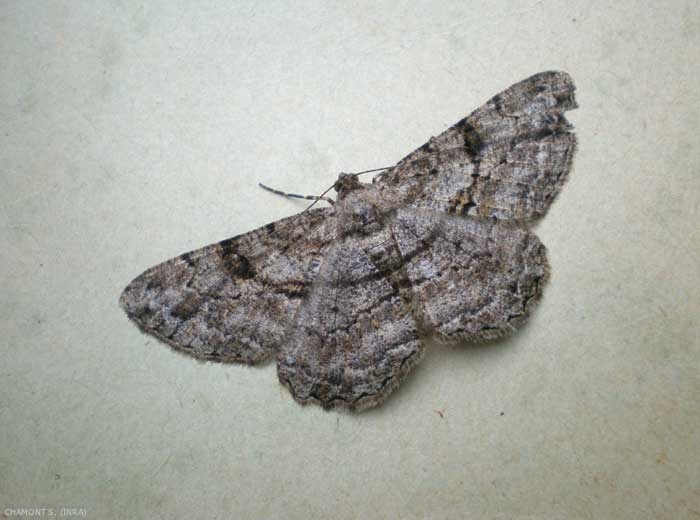 L'adulte mesure 4 à 5 cm d'envergure. Les ailes présentent des marbrures de couleur gris-blanchâtre et gris-brunâtre avec deux lignes noires en demi-cercle. Il existe des formes mélanisées de ce papillon. Les antennes chez le mâle sont plumeuses.
