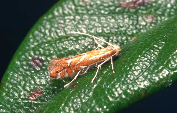 L'adulte est un petit papillon de 8 à 9 mm d'envergure. La tête est grise argentée, les ailes antérieures sont étroites, brunes dorées, avec de larges bandes blanches ou jaunâtres, fortement frangées. Les ailes postérieures sont très étroites avec de larges franges (figure 1).