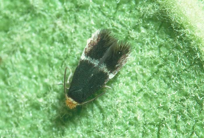 L'adulte présente une envergure de 4 mm. Les ailes sont noires avec une bande argentée sur les ailes antérieures (figure 1).