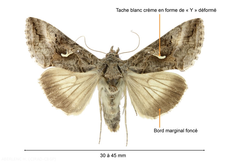 Cette espèce est principalement caractérisée par la tache blanc crème rappelant la forme de la lettre grecque gamma (ou d'un Y déformé) présente au milieu des ailes antérieures. Les ailes postérieures sont marron clair avec une large bande foncée marginale.