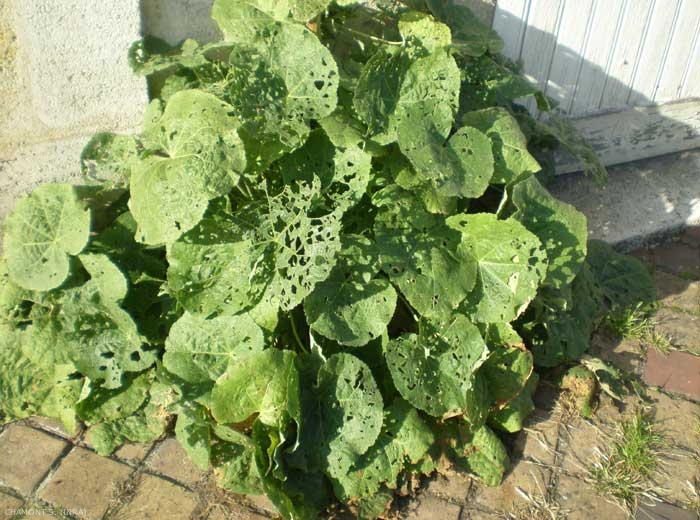 Les dégâts sont principalement provoqués par les larves âgées très voraces. Les déprédations liées aux larves de 1er et 2ème stade sont souvent insignifiantes et la présence des larves passe très souvent inaperçue du fait qu'elles se cachent en journée sous le feuillage. Les premiers dégâts visibles se manifestent avec les chenilles de 3ème et 4ème stade qui perforent le limbe des feuilles.