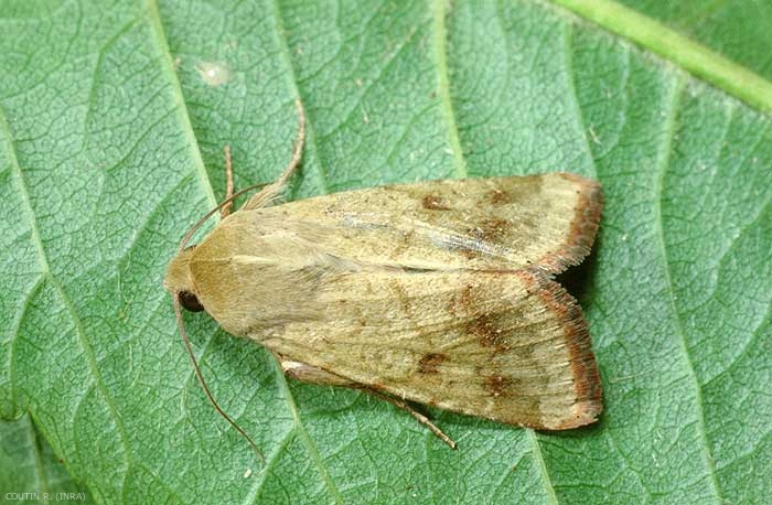 L'adulte présente des ailes antérieures de couleur jaunâtre tendant à l'orange chez la femelle et au gris-verdâtre chez le mâle, avec une légère bande transversale plus foncée dans le tiers distal. La tache réniforme est peu marquée et enfumée (figure 1). Les ailes postérieures sont gris clair avec une large bande marginale foncée et une petite tache brune tout près de la base. Il existe une forme foncée et une forme claire de ce papillon.