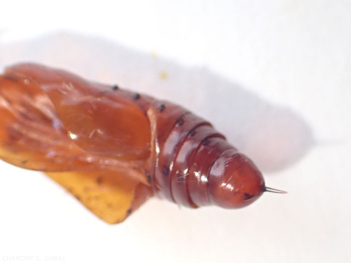 La chrysalide mesure 2 cm de long ; elle est de couleur brune. Le crémaster est constitué de deux longues épines parallèles (figure 5).