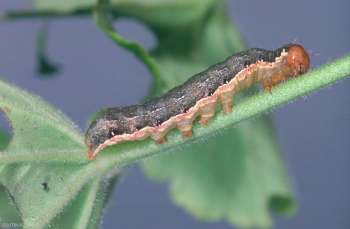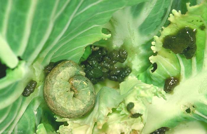 Mamestra brassicae est une noctuelle défoliatrice. Les dégâts se produisent surtout en juin, puis en septembre. Les chenilles détruisent une quantité importante de feuilles et leurs excréments s'accumulent dans la partie centrale du chou ou de la plante sur laquelle elles se développent (figure 4).