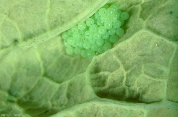 La ponte intervient peu après l'éclosion. La femelle pond un millier d'oeufs par groupes d'importances décroissantes (de 150 à quelques unités), à la face inférieure des feuilles des plantes nourricières (figure 1). L'évolution embryonnaire ne dure qu'1 à 2 jours.