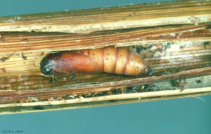La chrysalide, d'environ 2 cm de long, hémicylindrique, brun-châtain, a son crémaster formé de 4 fortes dents, 2 ventrales et 2 dorsales, plus petites (figure 3).