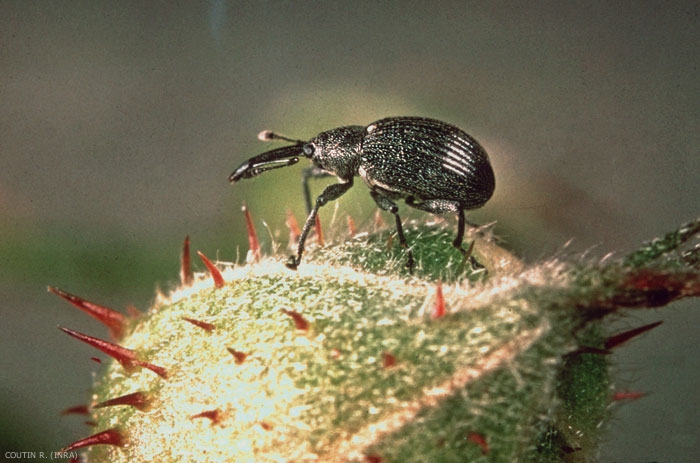 C'est avant tout le fraisier qui souffre des attaques très caractéristiques de cet insecte : le bouton floral ayant reçu l'oeuf ne se développe pas, se dessèche, pend le long du pédoncule et finit par tomber.