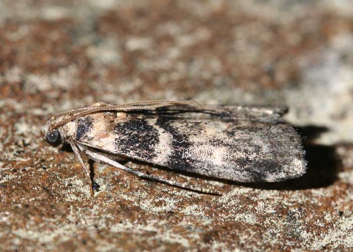 L'adulte (figure 1) est un papillon de teinte foncière beige foncé avec une envergure de 20 à 25 mm. Les ailes antérieures sont marquées de 2 lignes claires en zigzag. Les ailes postérieures sont quasi blanches, finement bordées de bistre clair.