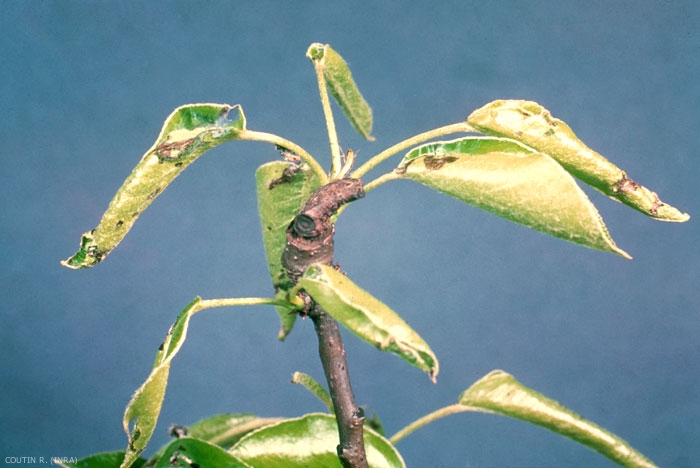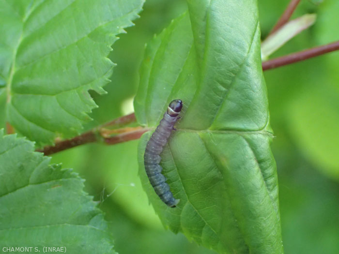 Le développement larvaire dure 28 à 55 jours. Les jeunes chenilles pénètrent dans les bourgeons puis rassemblent les jeunes feuilles par des toiles soyeuses. Par la suite, elles enroulent les feuilles en faisant une sorte de cigare et rongent le parenchyme en ne respectant que les nervures (figure 1) ; les pousses terminales sont les plus attaquées. Lorsqu'elles pénètrent à l'intérieur des bourgeons encore fermés, elles incisent le pédoncule au dessous du calice. Au moment de la floraison, elles rongent les étamines et le pistil en reliant les pétales par des fils soyeux ; ce mode d'attaque est surtout fréquent sur le pommier.