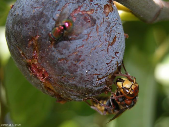 Le frelon est essentiellement prédateur d'insectes les plus divers, y compris d'abeilles. A partir de l'été, il devient de plus en plus phytophage, se nourrissant d'aliments liquides sucrés : sève (figure 1), jus des fruits (raisin, pommes, poires, prunes) mûrs, nectar (figure 2).