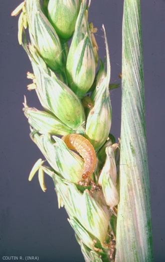 * les grains sont atrophiés, la larve a sectionné une partie de la tige, perturbant le flux de sève ; l'épi mal nourri présente de nombreux grains tout petits.