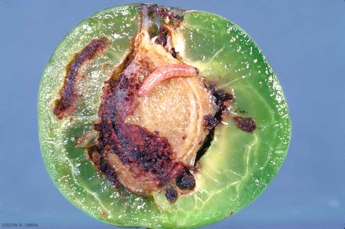 La ponte a lieu le soir, lorsque la température dépasse 15°C. La fécondité moyenne est généralement de 45 oeufs. La durée d'évolution de l'oeuf est de 9 à 15 jours. La durée de développement de la larve est 20 à 25 jours. La chenille pénètre très rapidement dans la pulpe du fruit et se dirige vers la base du pédoncule dont elle sectionne les faisceaux libéro-ligneux (figure 2) ; à la fin de sa croissance, elle abandonne le fruit et se nymphose (1ère génération) ou tisse un cocon d'hibernation sous un abri à la surface du sol ou sous l'écorce (2ème génération).
