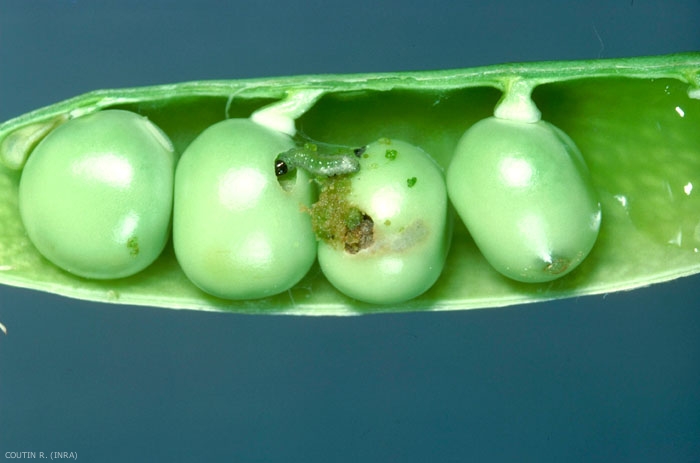 L'adulte recherche les endroits non ventilés et à végétation dense. Il est actif l'après midi, lorsque la température dépasse 17°C. La ponte s'échelonne sur 5 à 11 jours après l'éclosion. La femelle dépose 1 à 3 oeufs sur les stipules, les folioles ou les gousses (figure 1). L'évolution embryonnaire dure de 1 à 3 semaines selon la température. La chenille passe par un très court stade baladeur (1 jour) avant de pénétrer dans une jeune gousse (figure 2). Le développement larvaire dure 18 à 30 jours, puis la larve quitte les gousses et migre dans le sol où elle tisse un cocon comportant des particules de terre agglomérées dans lequel elle hiverne.