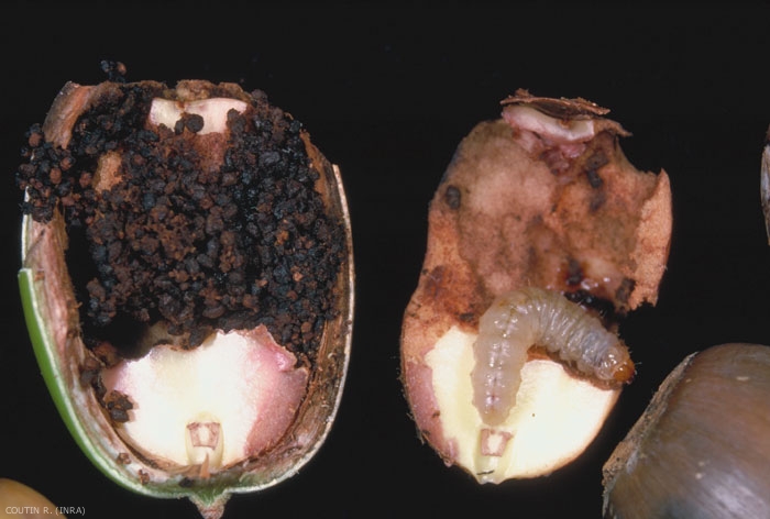 La ponte commence 24 heures après la sortie des femelles et s'échelonne sur une dizaine de jours. La fécondité moyenne est généralement de 60 oeufs. Les oeufs sont déposés à la face inférieure et surtout à la face supérieure des feuilles. Leur durée de développement est de 10 à 15 jours. La larve passe par 5 stades et sa croissance dure 3 semaines. La jeune chenille circule sur le feuillage et les rameaux puis pénètre dans les bogues au voisinage du point d'insertion ; elle s'introduit dans le fruit par le hile puis ronge l'intérieur de l'amande et souille le fruit de ses excréments (figure 1).