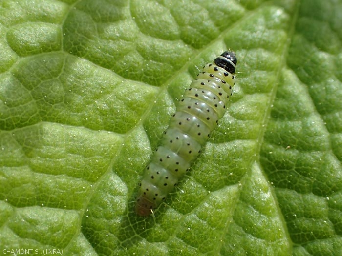 La jeune chenille est jaune pendant 8 jours puis son corps devient vert sombre avec, sur chaque segment, une rangée transversale de petits tubercules noirs portant chacun une fine soie. La tête et la plaque thoracique sont noir brillant. Avant hibernation, la larve ne mesure que 6 à 8 mm ; à son complet développement, elle est épaisse, effilée aux 2 extrémités et atteint 18 à 29 mm (figure 2).