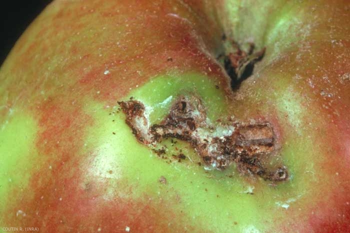Une seule chenille peut provoquer le dessèchement de 2 à 3 inflorescences. Par ailleurs, les jeunes chenilles mordillent superficiellement l'épiderme des pommes tardives (figure 3 et 4), ce qui peut entraîner le développement de champignons et la pourriture du fruit.