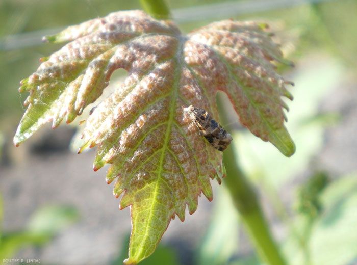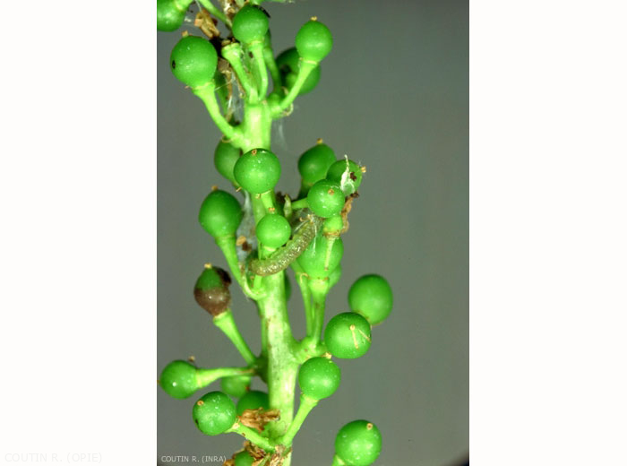 La durée de développement de l'embryon est de 6 à 9 jours pour la 1ère génération ; elle n'est plus que de 4 à 6 jours pour les générations suivantes, la température étant plus élevée. La larve de 1ère génération a un "stade baladeur" de quelques heures. Après s'être glissée entre 2 ou 3 boutons floraux, elle tisse quelques fils puis perfore les enveloppes florales et pénètre dans le bouton ; elle s'introduit parfois dans le pédoncule de la grappe et provoque le dessèchement de celle-ci. La chenille est active et tisse un fourreau relativement volumineux mais difficile à déceler. Les chenilles des générations ultérieures se déplacent quelques minutes seulement et se développent aux dépens des grains : elles en rassemblent plusieurs à l'aide de fils de soie puis les mordillent ou pénètrent à l'intérieur (figure 1).