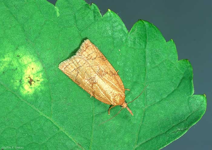 L'adulte mesure 20 à 25 mm d'envergure. La tête est brune avec 2 longs palpes labiaux dirigés à l'avant formant une sorte de rostre. Les ailes antérieures sont trapézoïdales, jaune paille avec 3 bandes transversales brun rougeâtre ; les ailes postérieures sont uniformément gris ardoise et finement frangées (figures 1 et 2).