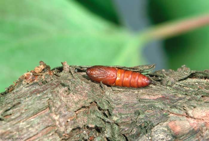 La chrysalide est déposée dans le repli d'une feuille ou dans repli de l'écorce (figure 2).
