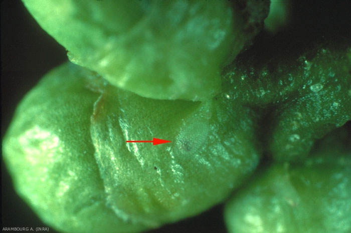 L'oeuf aplati, lenticulaire, à contour plus ou moins ovale mesure 0,5 x 0,4 mm, avec un chorion réticulé. Blanchâtre à la ponte (figure 2), il brunit et fonce au fur et à mesure du développement de l'embryon ; les oeufs dans lesquels l'embryon est mort jaunissent.
