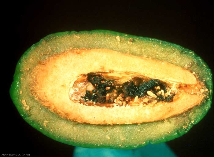 La récolte peut être anéantie. La génération carpophage est également très préjudiciable. Les chenilles provoquent la chute prématurée des olives, soit en y pénétrant, soit en les quittant pour se nymphoser (figure 5).