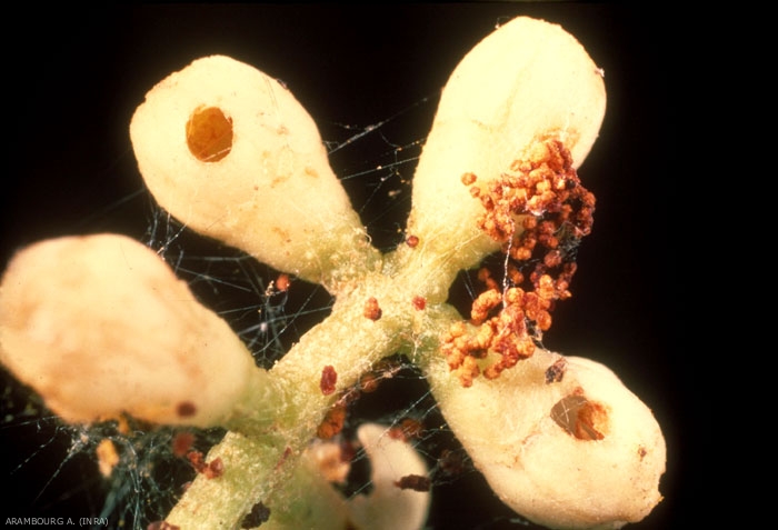 La génération anthophage est très dangereuse : elle attaque en effet les organes reproducteurs et détruit directement ou indirectement (avortements consécutifs à l'enserrement des bouquets floraux par les fils de soie des chenilles) les futurs fruits (figure 4).