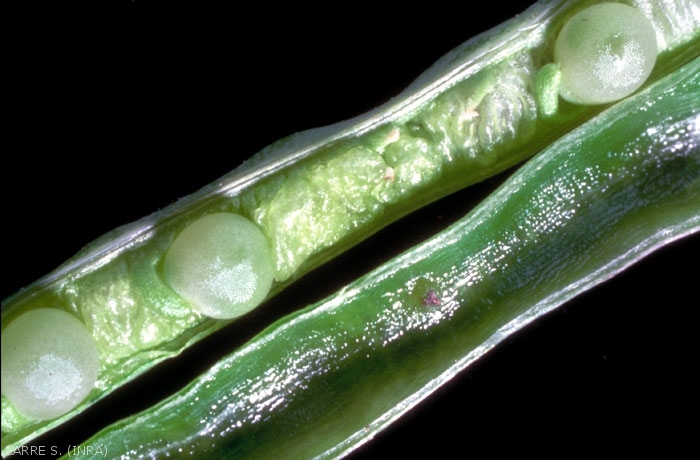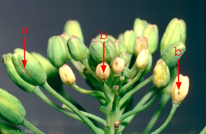 En outre, les morsures et les piqûres de ponte permettent aux Cecidomyiidae, en particulier à la cécidomyie des siliques des crucifères (Dasineura napi), de déposer leurs oeufs en très grande quantité et de causer des ravages supplémentaires. L'activité larvaire des Cecidomyiidae entraîne l'éclatement des siliques et les pertes peuvent alors atteindre 50% de la récolte.