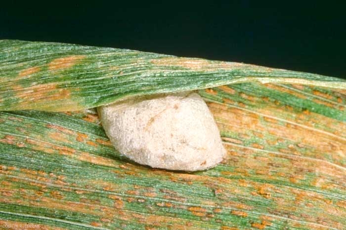 La larve se nymphose dans une coque blanche sur les feuilles, les tiges et les épis (figure 2). La nymphose dure environ 2 semaines (fin juillet). Des températures inférieures à 16 ou 17°C en mai-juin et des précipitations importantes provoquent une mortalité élevée des larves et des nymphes.