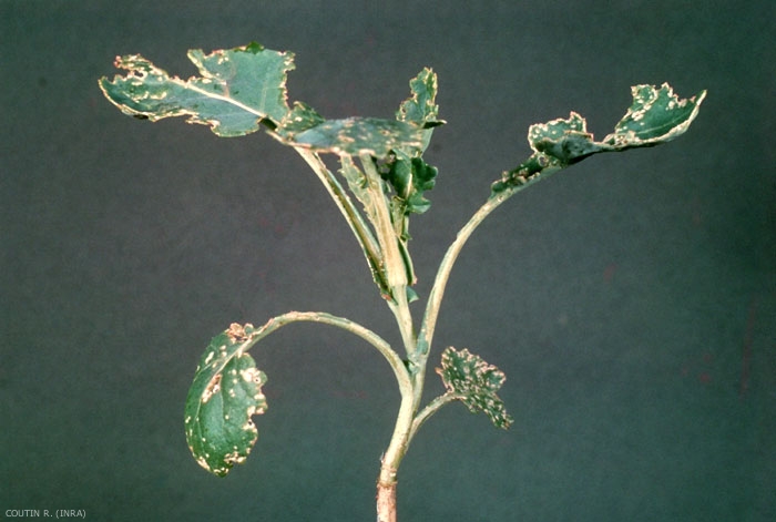 Le jeune adulte peut être nuisible aux semis d'automne en période chaude et ensoleillée ; il ravage également les jeunes semis de printemps lors de sa reprise d'activité. L'insecte vit sur les feuilles des crucifères qu'il décape et perfore, notamment par temps chaud et sec (figures 2 et 3).
