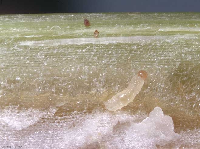 La larve de dernier stade mesure entre 4 et 6 mm de long. Elle est apode, blanche et possède une capsule céphalique jaunâtre (figure 2).