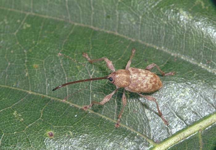 L'adulte mesure entre 6 et 9 mm, il est de couleur jaunâtre à grisâtre, recouvert d'une épaisse pubescence. Le rostre grèle est fortement incurvé, celui de la femelle est aussi long que le corps (figure 1).