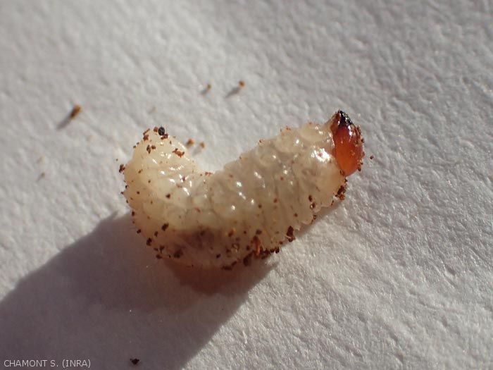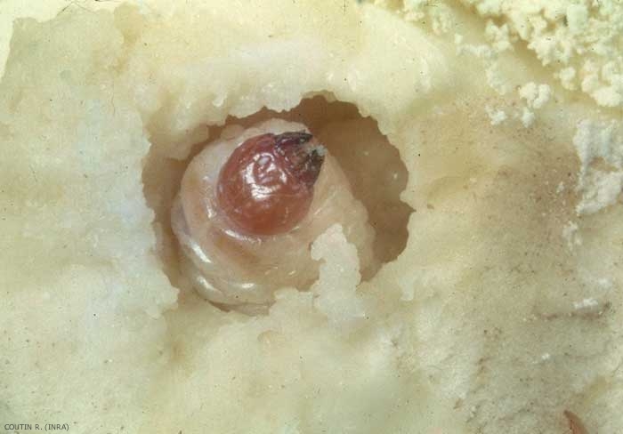 La larve mesure 15 mm, elle est apode, épaisse, incurvée, blanc crème à tête brune (figure 2).