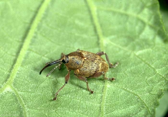 L'adulte mesure 7 à 8 mm, il est entièrement roux grisâtre et recouvert d'une forte pubescence. Le rostre est grêle et fortement incurvé ; il est plus long que le corps chez la femelle et plus court chez le mâle (figure 1).